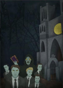 In the novel, five book collectors arrive at an abandoned church and meet a mysterious monk, who makes